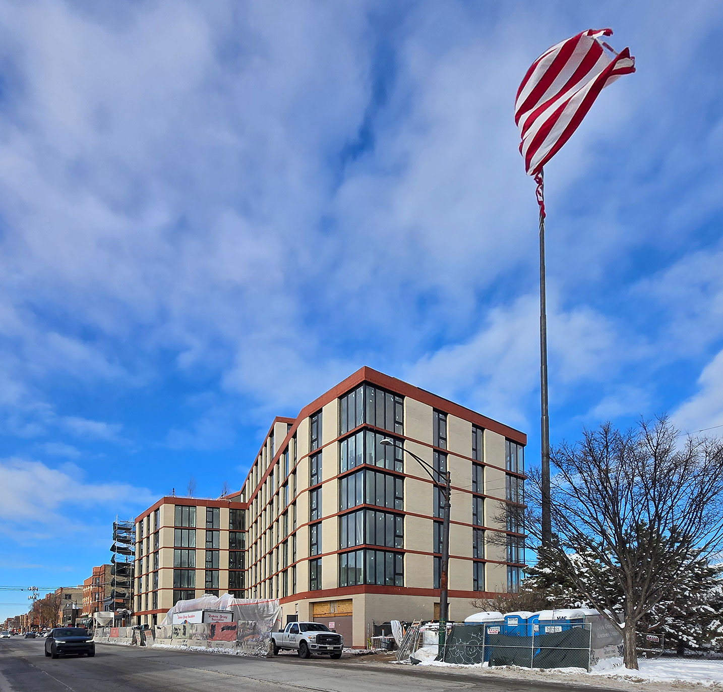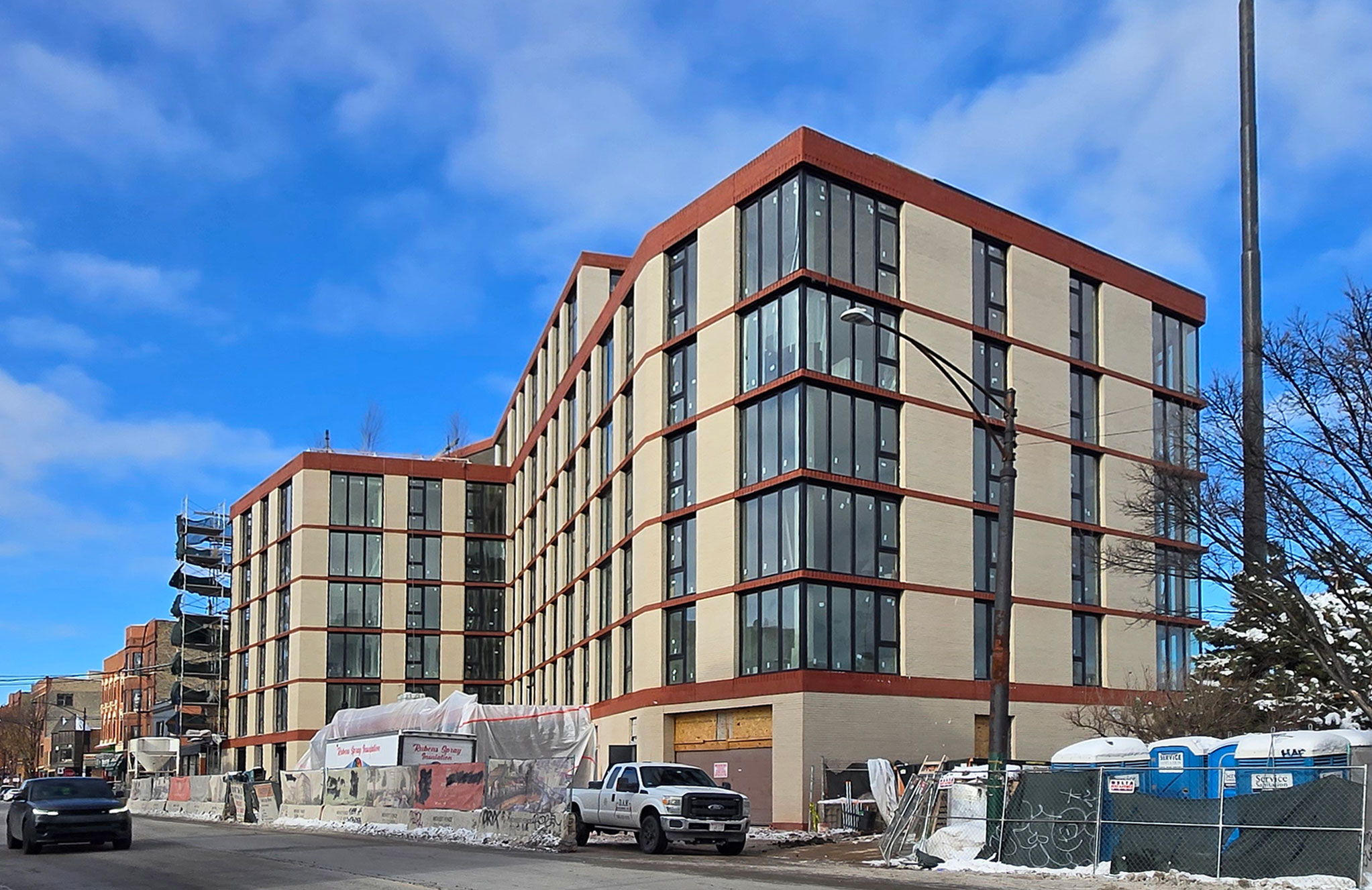 Located on the edge of the prominent West Town neighborhood of Chicago, this residential project presents a prismatic form that responds to its surroundings and its irregular site, resulting in a cohesive blend of historic and modern. Both the challenges and successes of this development stem from its singular location between the famous Fulton Market corridor, an adjacent early 20th Century streetscape, and the highly visible access ramp to the adjacent expressway.